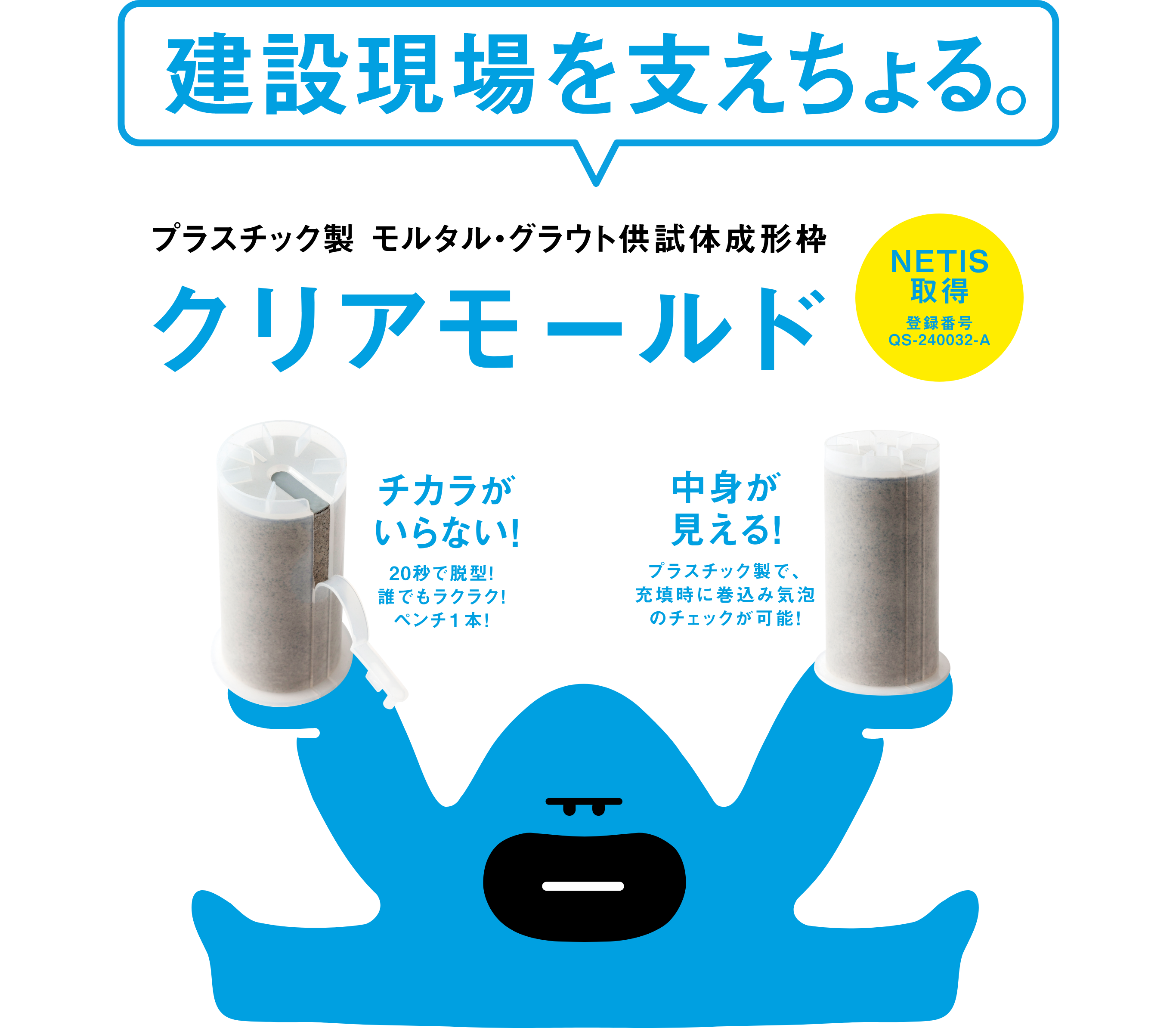 さらに現場サイドから安心できる供試体作成の為、中が見える透明モールドがあると嬉しいとの意見が出たため、脱型時間の短縮(脱型しやすさ)と中身が見える透明モールドの開発に挑戦することになりました。何度も改良を重ね「クリアモールド」が誕生し、いまでは特許・NETISも取得することができました。