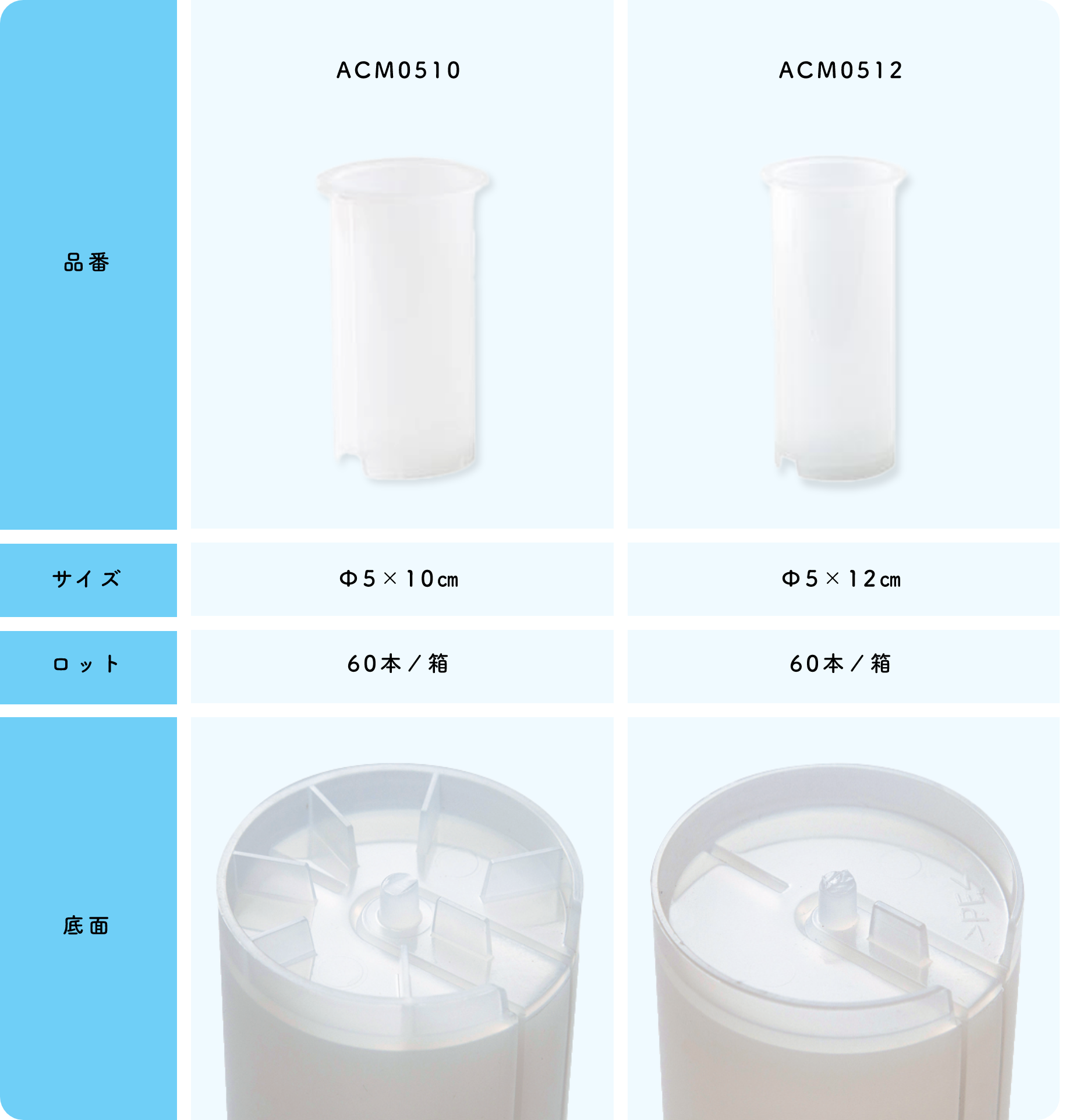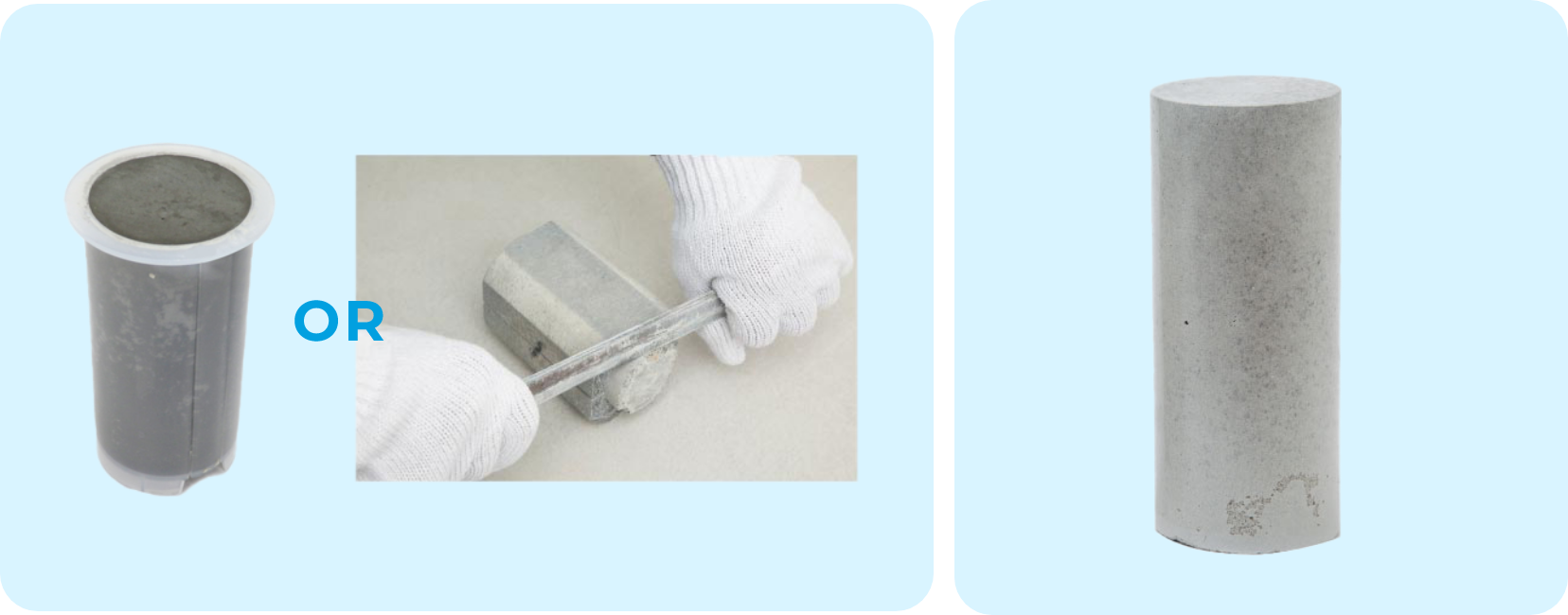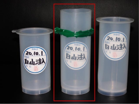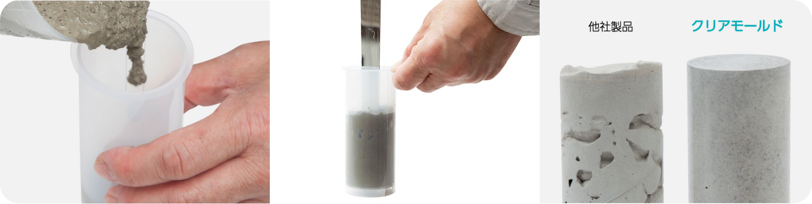 ・本製品はプラスチック製品ですので、充填材料硬化までモールドに過度な圧力をかけない・供試体移送も行わないでください。特にセメント改良土など、大きな力にて突き固める供試体作製はモールド側面・底面に変形を及ぼし、仕上がり供試体に影響を与えます。